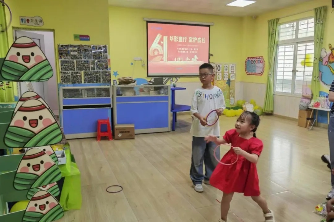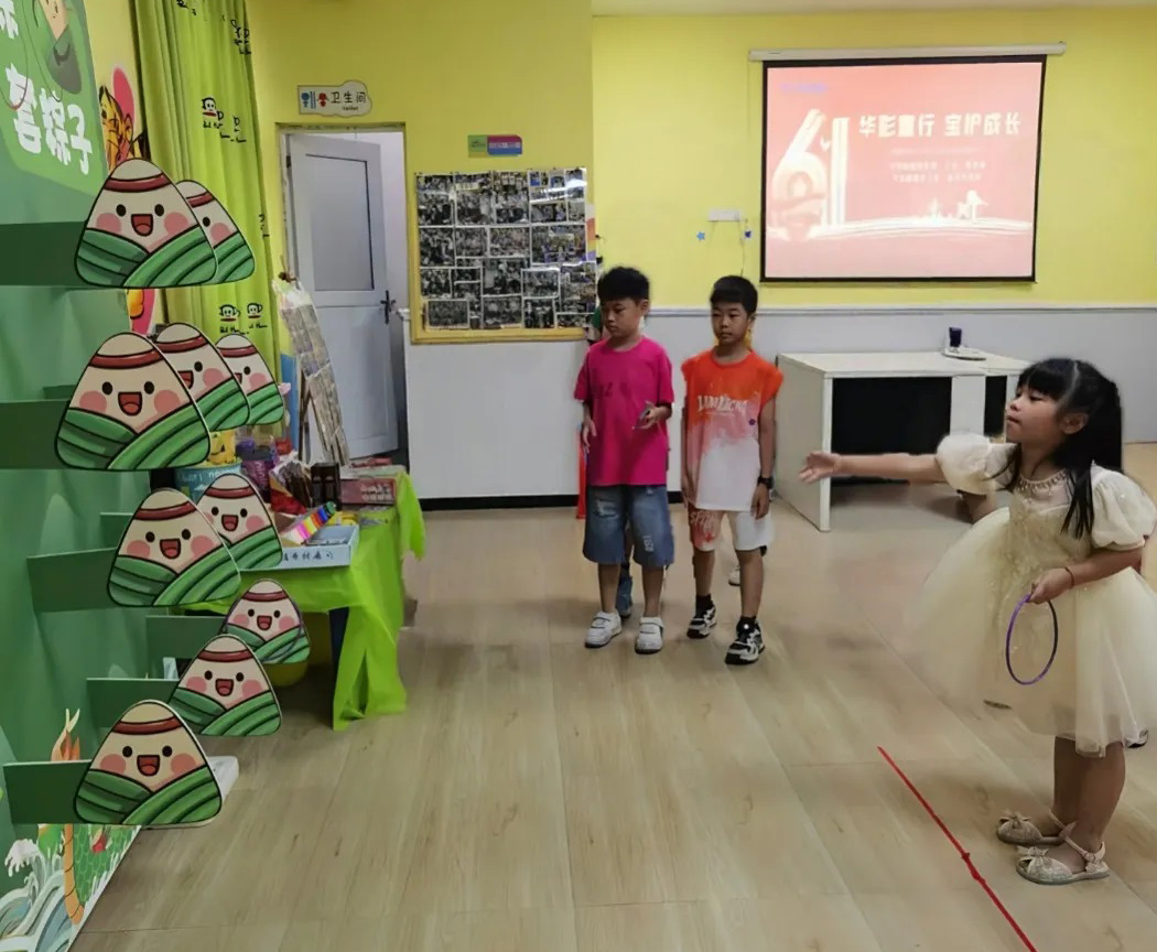 趣味“蹲蹲樂(lè)" 游戲環(huán)節(jié)設(shè)置了“蹲蹲樂(lè)”和“端午套粽”兩大關(guān)卡。在“蹲蹲樂(lè)”中,孩子們聽(tīng)到指令后迅速反應(yīng),模仿不同動(dòng)物的蹲姿,現(xiàn)場(chǎng)笑聲不斷。 歡樂(lè)“端午套粽” “端午套粽”則結(jié)合傳統(tǒng)節(jié)日元素,小朋友們瞄準(zhǔn)目標(biāo),奮力一擲,玩得不亦樂(lè)乎。游戲設(shè)置了層層獎(jiǎng)勵(lì),未通關(guān)的孩子也獲得了暖心安慰獎(jiǎng),確保每位參與者都能滿載而歸。